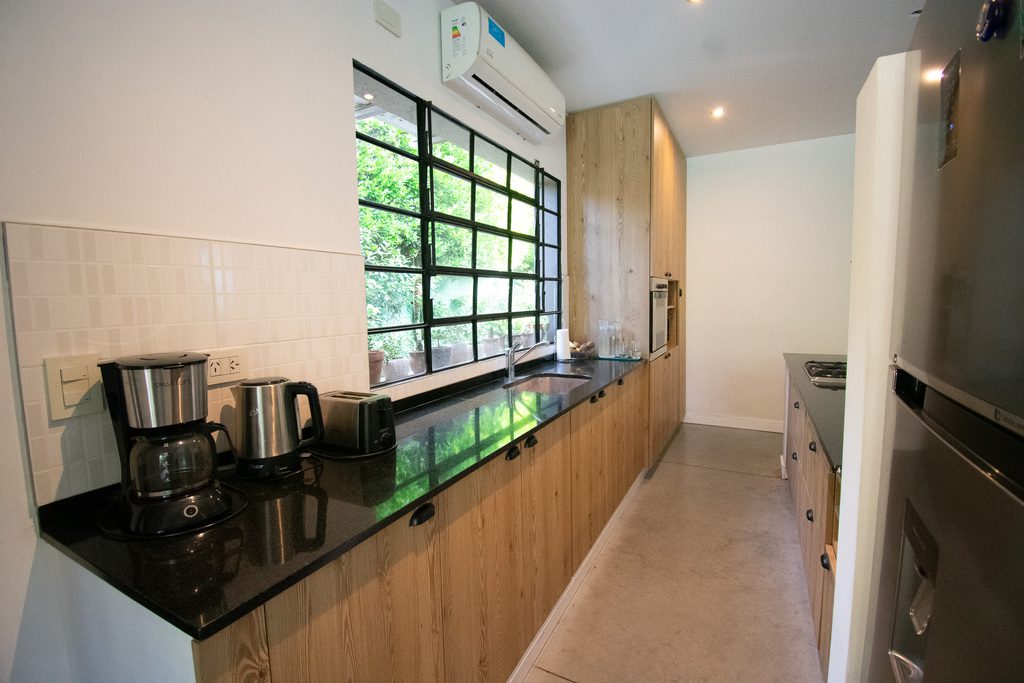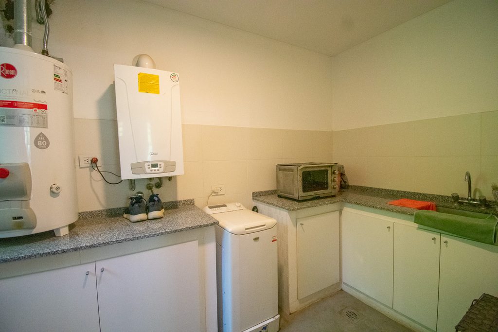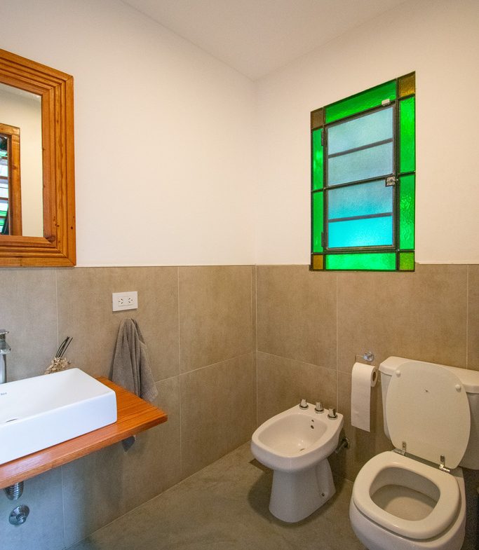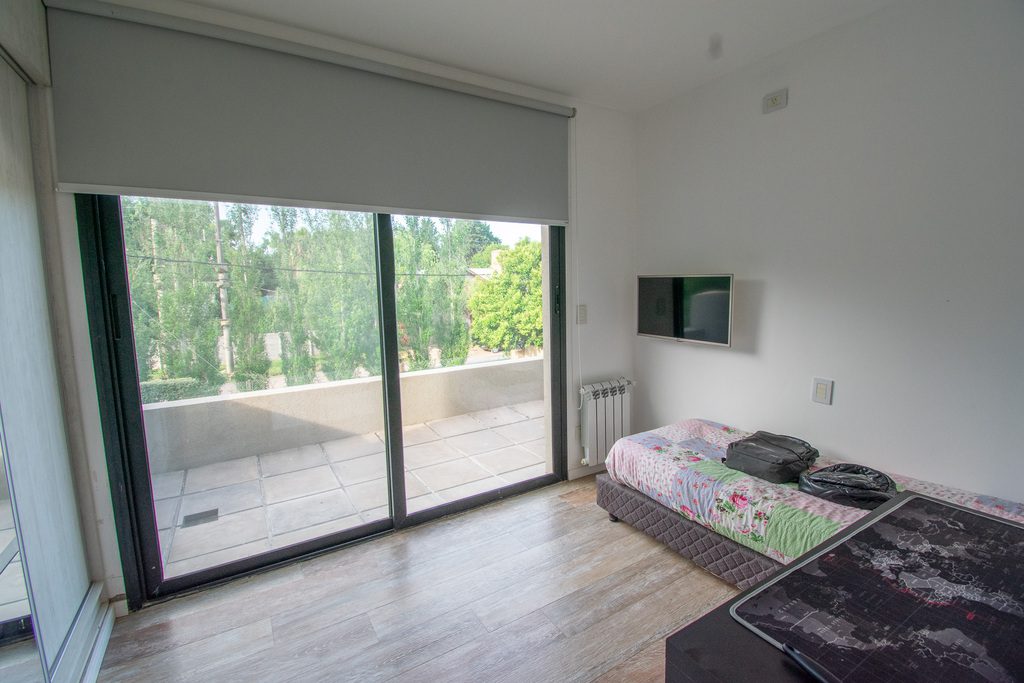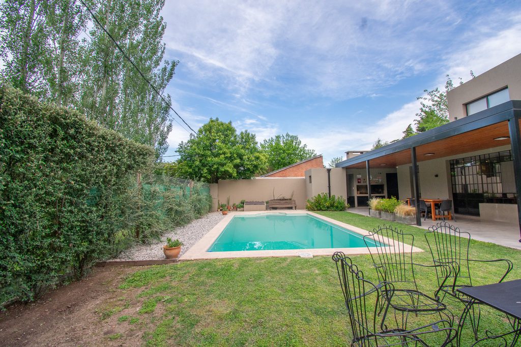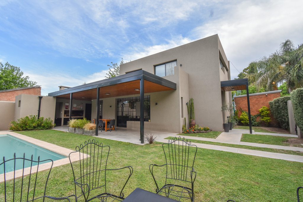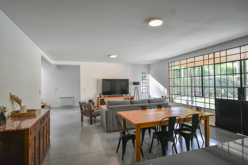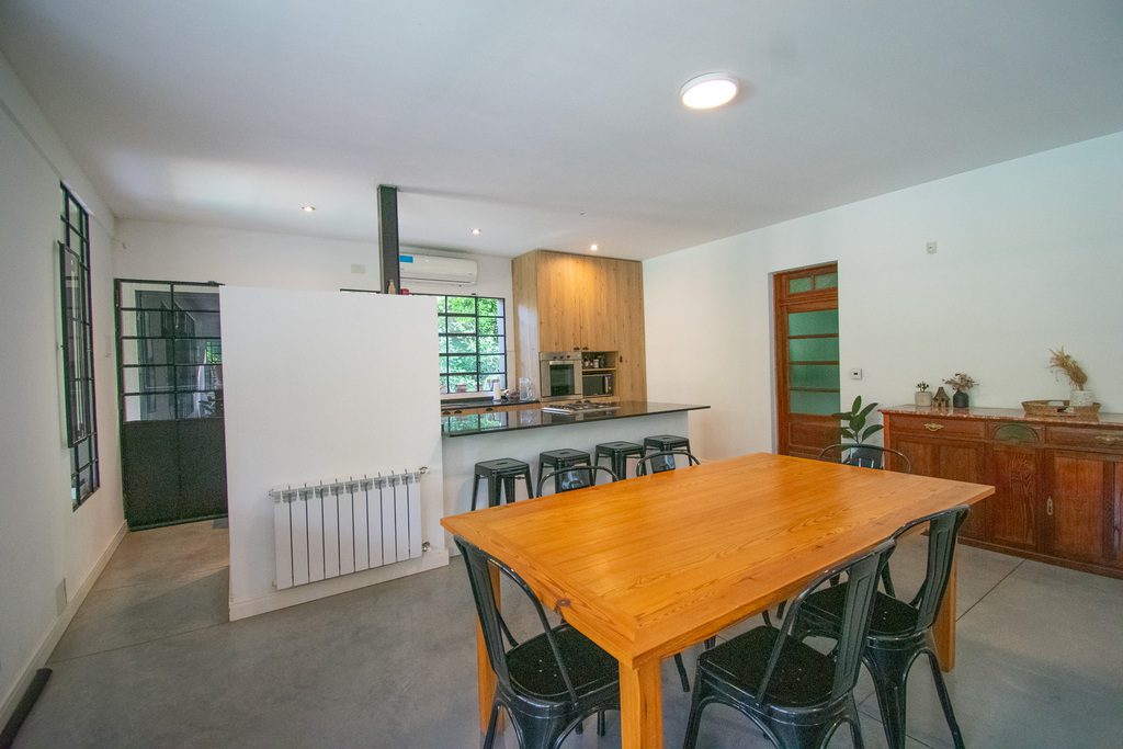 Casa de diseño rústico con detalles únicos, ubicada en un terreno esquinero. Construida con piso de hormigón llaneado, aberturas de vidrio repartido y puertas recicladas de madera, combinan calidez, luz natural y materiales nobles. En planta baja cuenta con un hall de ingreso que conecta con un amplio ambiente integrado de living, comedor y cocina con isla, todo con vista al jardín parquizado. En este nivel también se encuentra un lavadero independiente de cómodas dimensiones y un toilette. En planta alta se ubican dos dormitorios: el principal con baño en suite y vestidor, y un segundo dormitorio con baño completo. Ambos dormitorios tienen salida a un balcón corrido, orientado al norte. La doble altura de la escalera, de hierro y madera con vidrios de colores, aporta mucha luz y un toque distintivo al conjunto. El exterior se completa con una pileta de 8×4 y un entorno verde muy cuidado, ideal para disfrutar al aire libre.