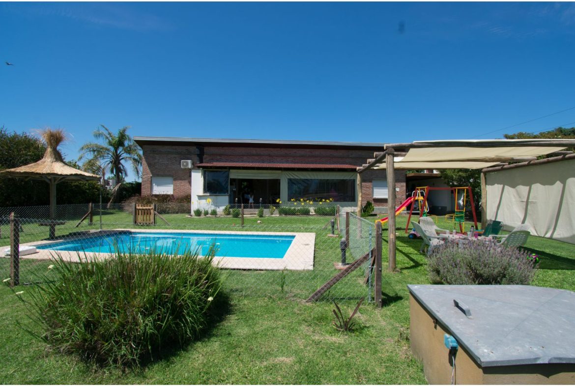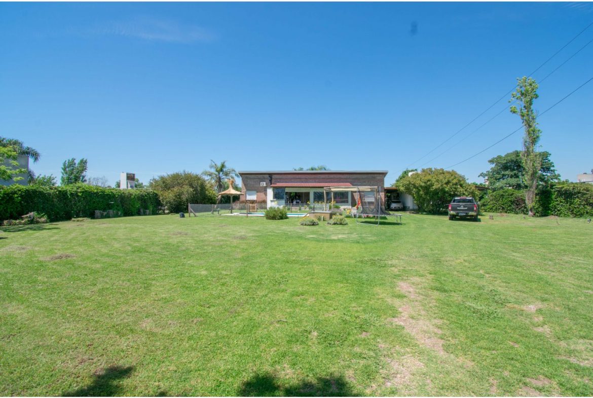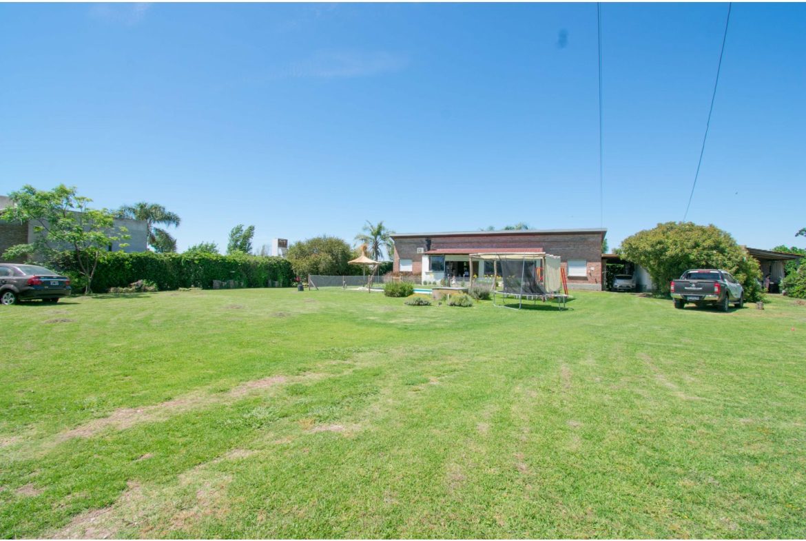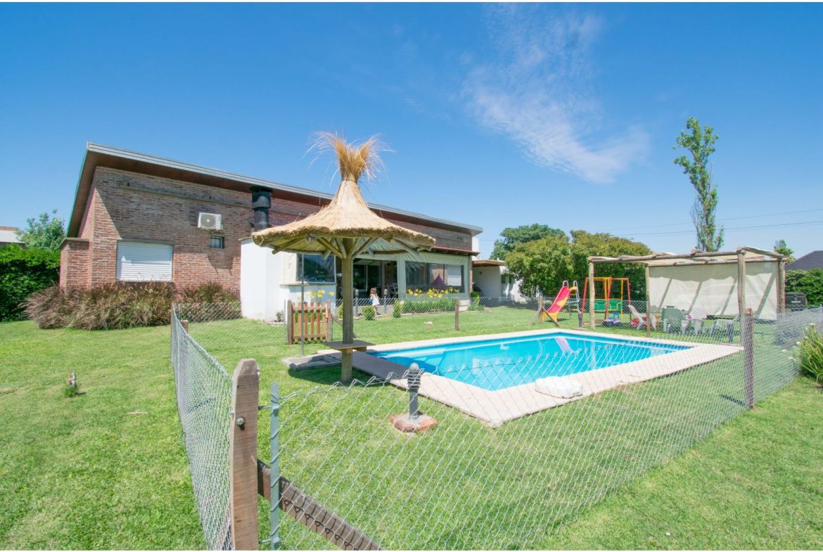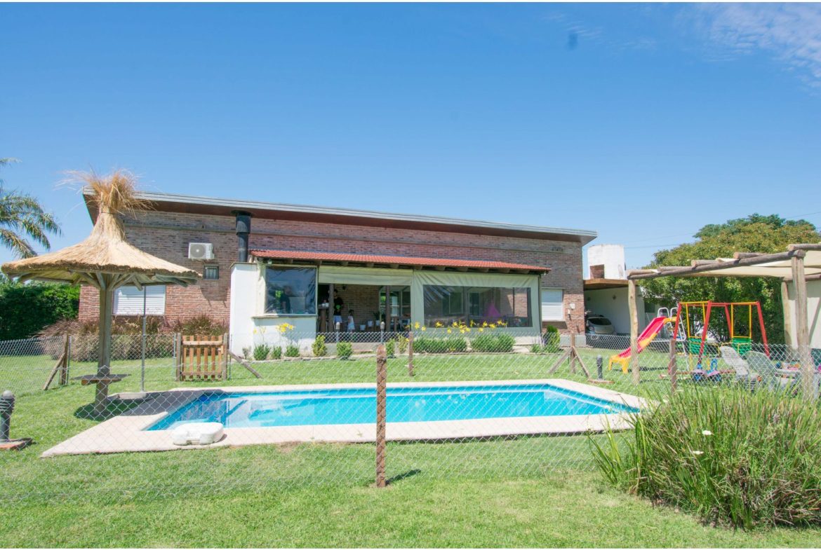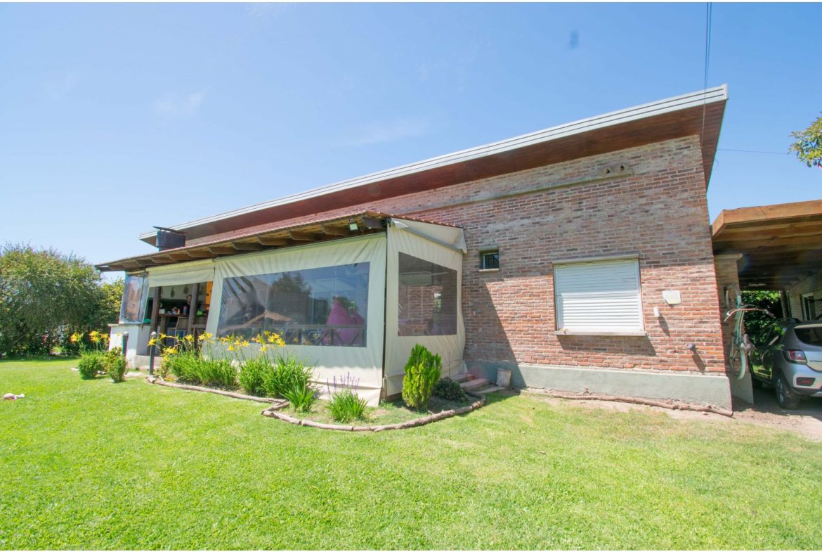 Casa estilo de Campo con 1400 m2 de parque y en un barrio con todos los servicios, Villa Elvira. La casa, emplazada en una planta con ambiente amplio y luminoso de uso diario como living comedor, cocina por separado. 2 dormitorios totalmente amueblados, cada uno de ellos con baño en suite. Quincho cubierto con parrillero y cortinas. Piscina con todo su equipamiento funcionando. Cochera para 2 vehículos.