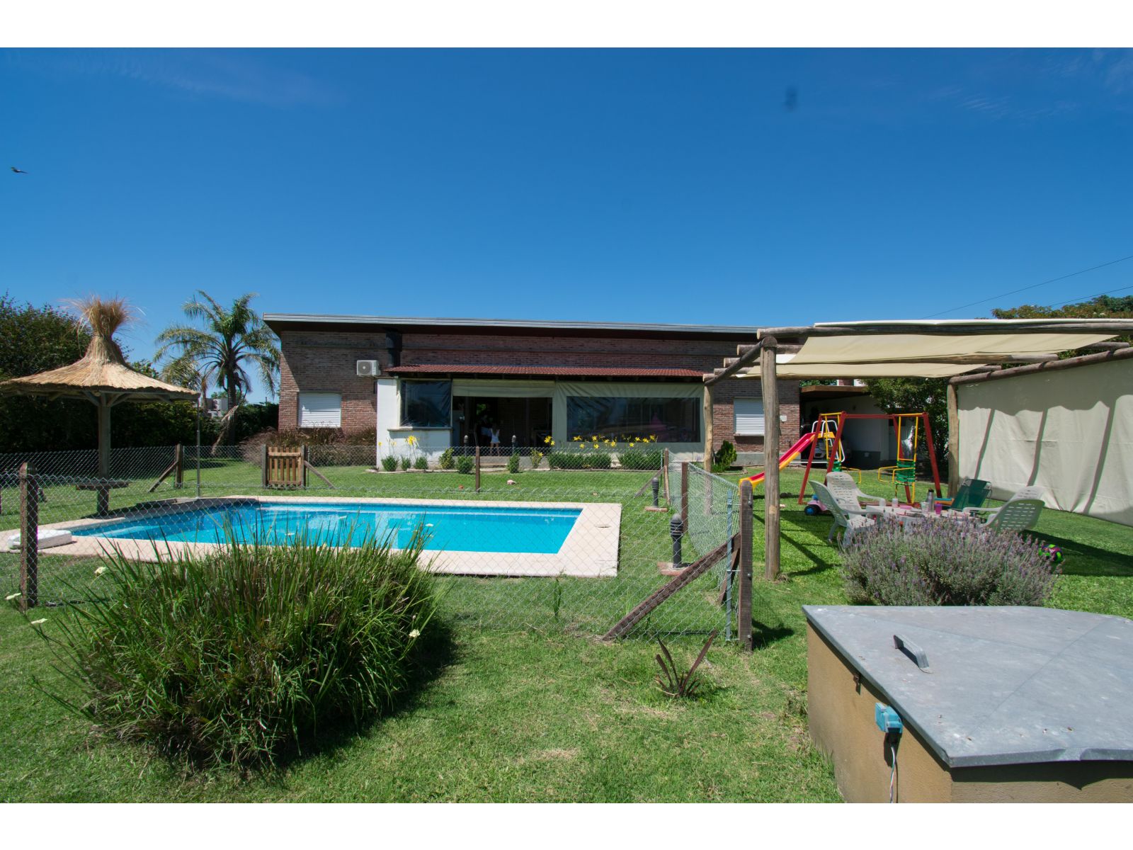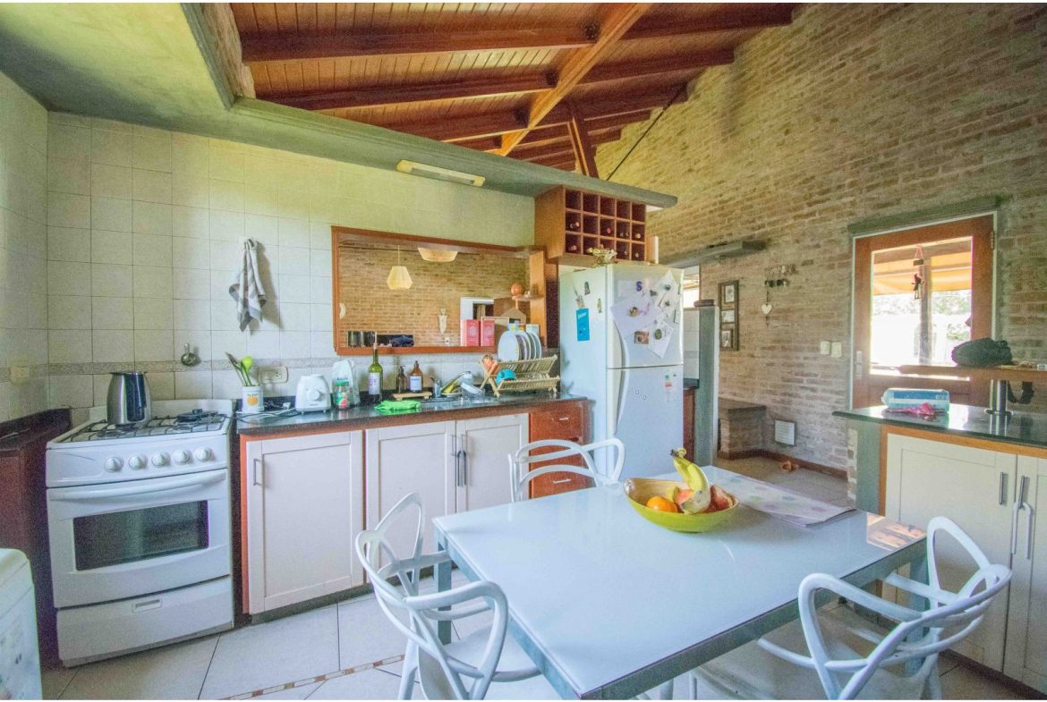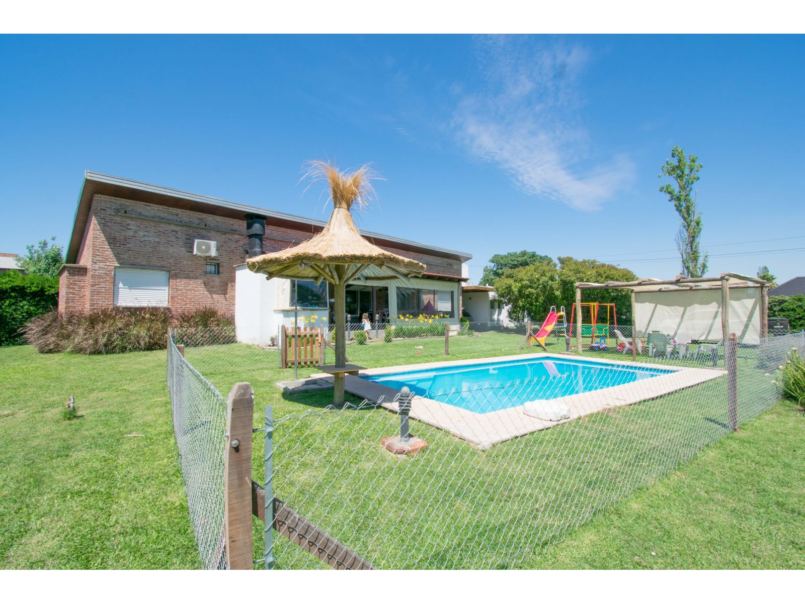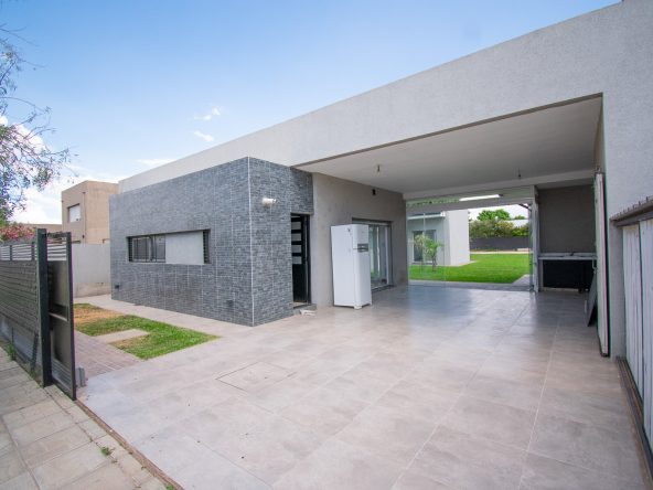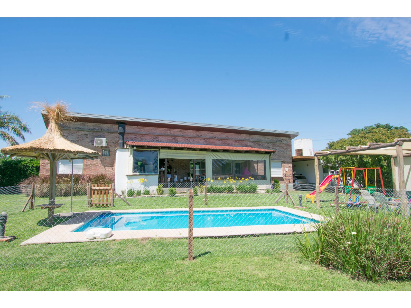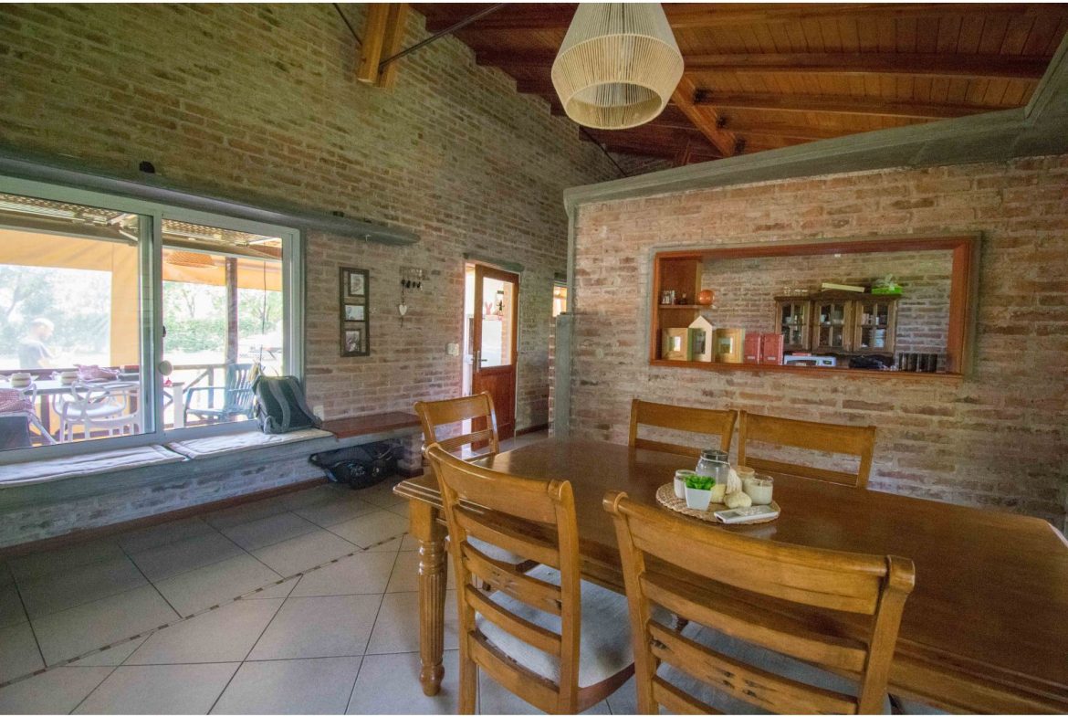 Casa estilo de Campo con 1400 m2 de parque y en un barrio con todos los servicios, Villa Elvira. La casa, emplazada en una planta con ambiente amplio y luminoso de uso diario como living comedor, cocina por separado. 2 dormitorios totalmente amueblados, cada uno de ellos con baño en suite. Quincho cubierto con parrillero y cortinas. Piscina con todo su equipamiento funcionando. Cochera para 2 vehículos.